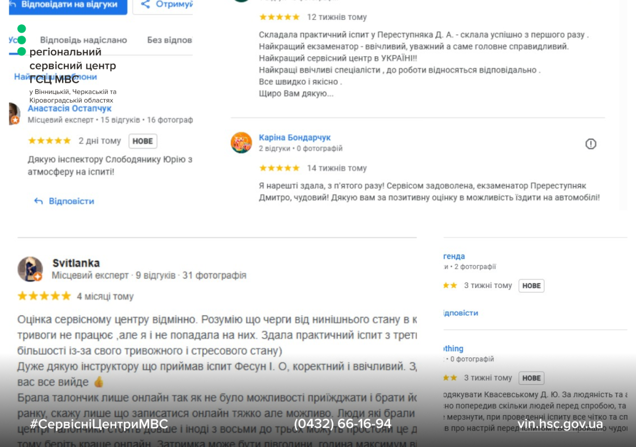 Приємно, що гарні відгуки залишають і про екзаменаторів інших сервісних центрів Вінницької, Черкаської та Кіровоградської областей. Для нас – це висока оцінка щоденної роботи, підтвердження того, що людяність професіоналізм і відповідальність мають справжню цінність.
