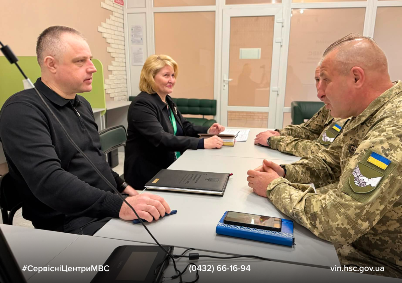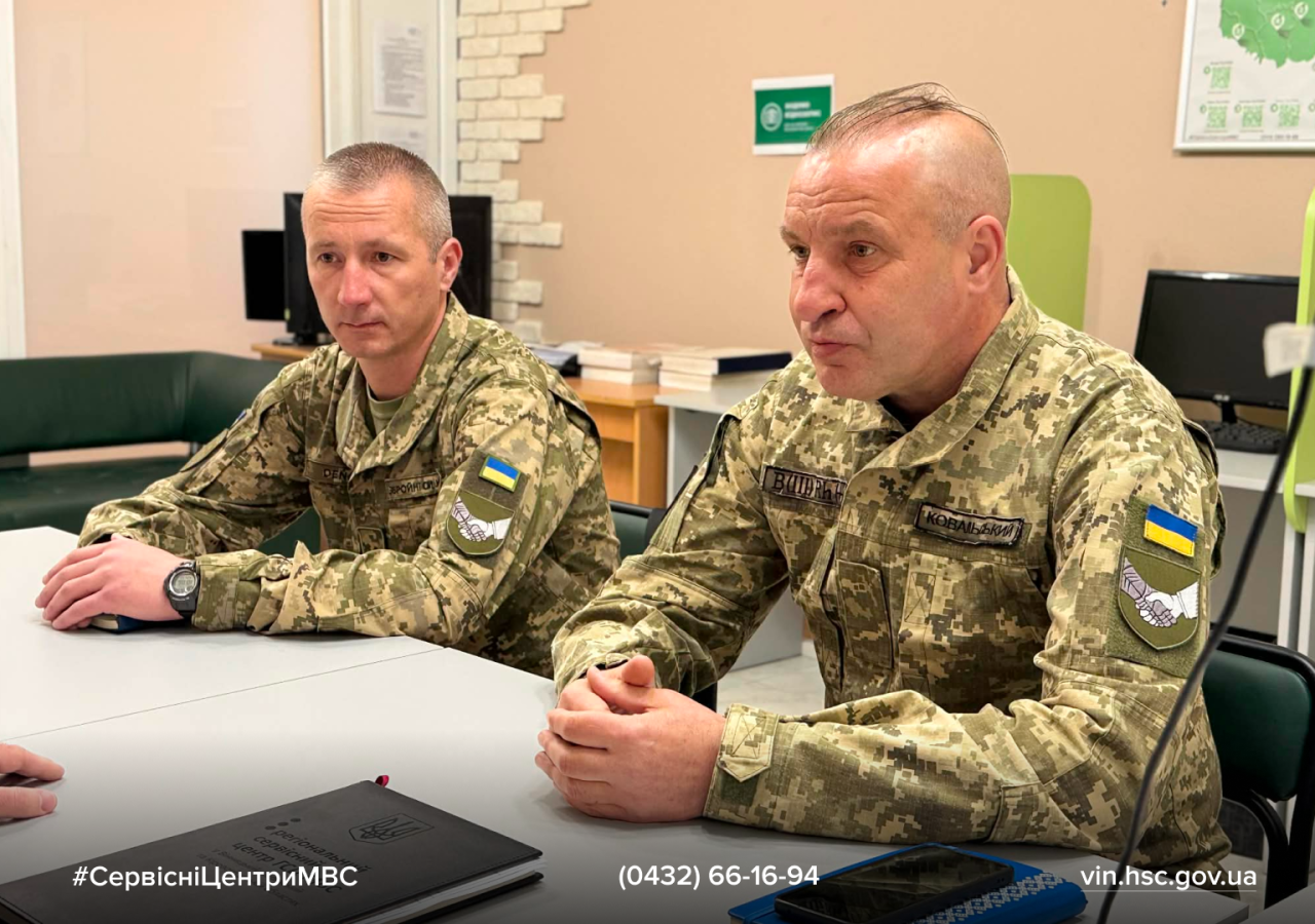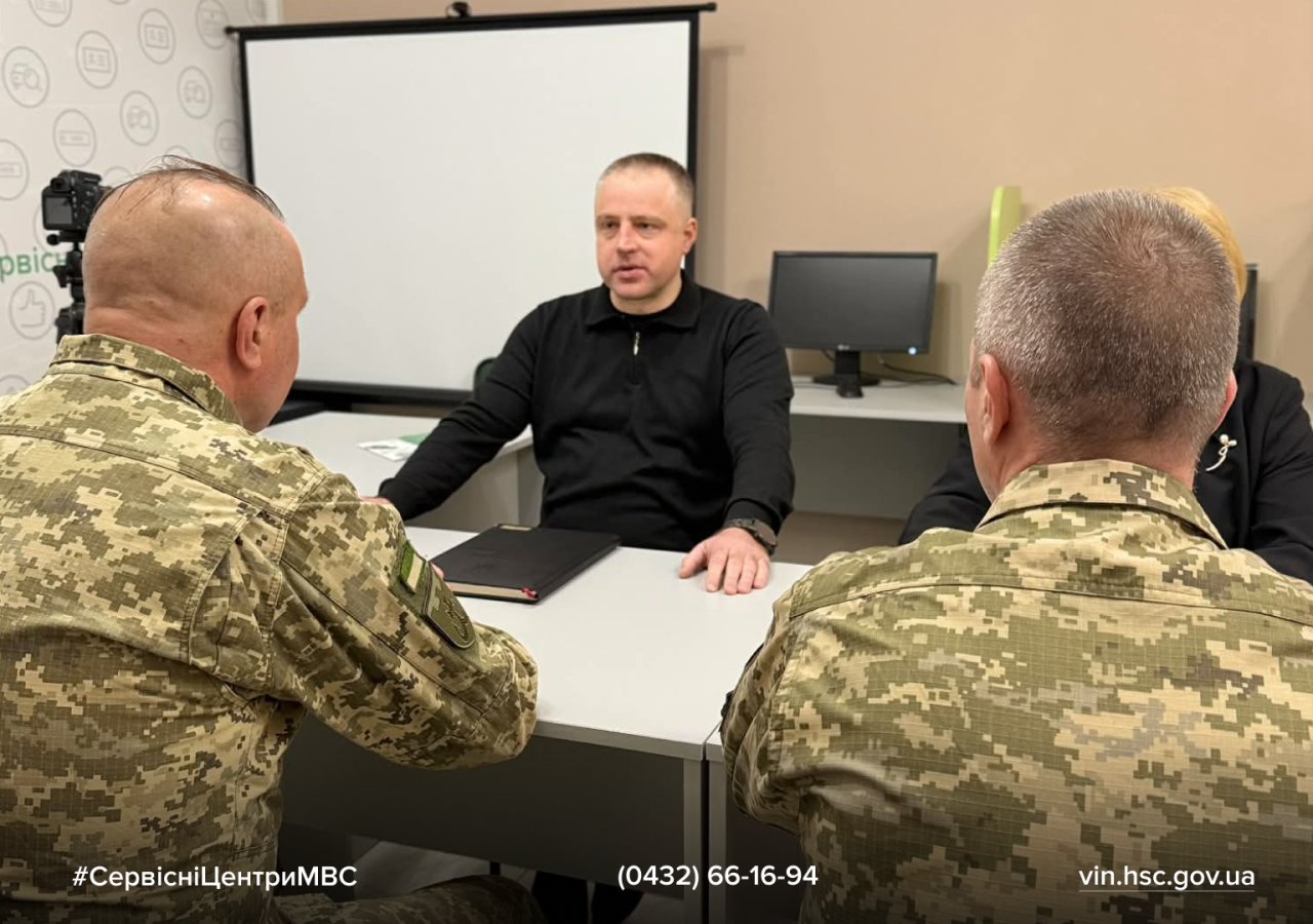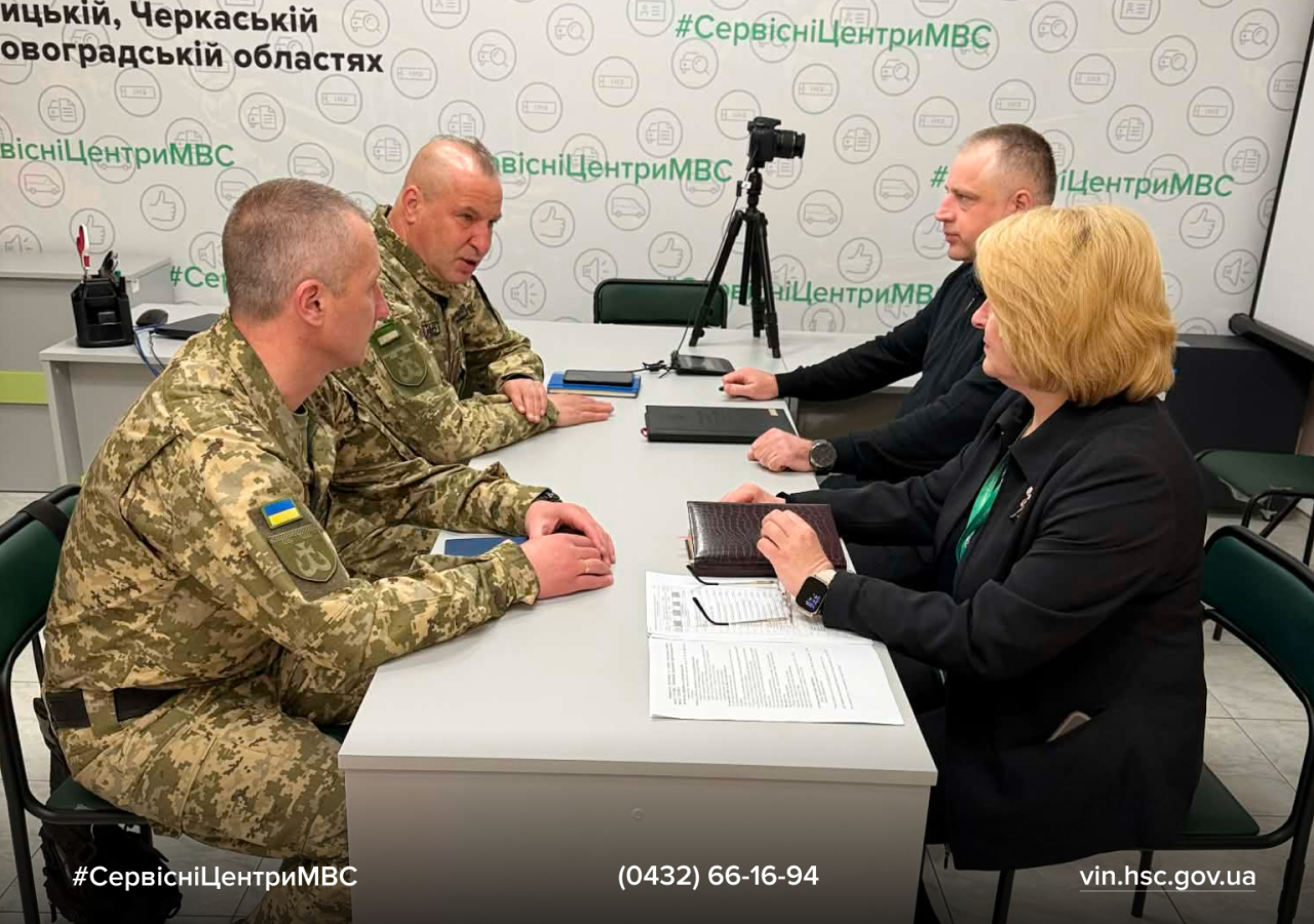 Днями відбулася робоча зустріч керівництва регіонального сервісного центру МВС із представниками Вінницької бригади територіальної оборони. До обговорення долучилися офіцер відділу цивільно-військового співробітництва Денис Русавський, фахівець патронатної служби ЦВС, старший солдат Роман Ковальський, начальник регіонального сервісного центру МВС у Вінницькій, Черкаській та Кіровоградській областях Сергій Гайду та начальниця відділу персоналу РСЦ Тетяна Бойко.